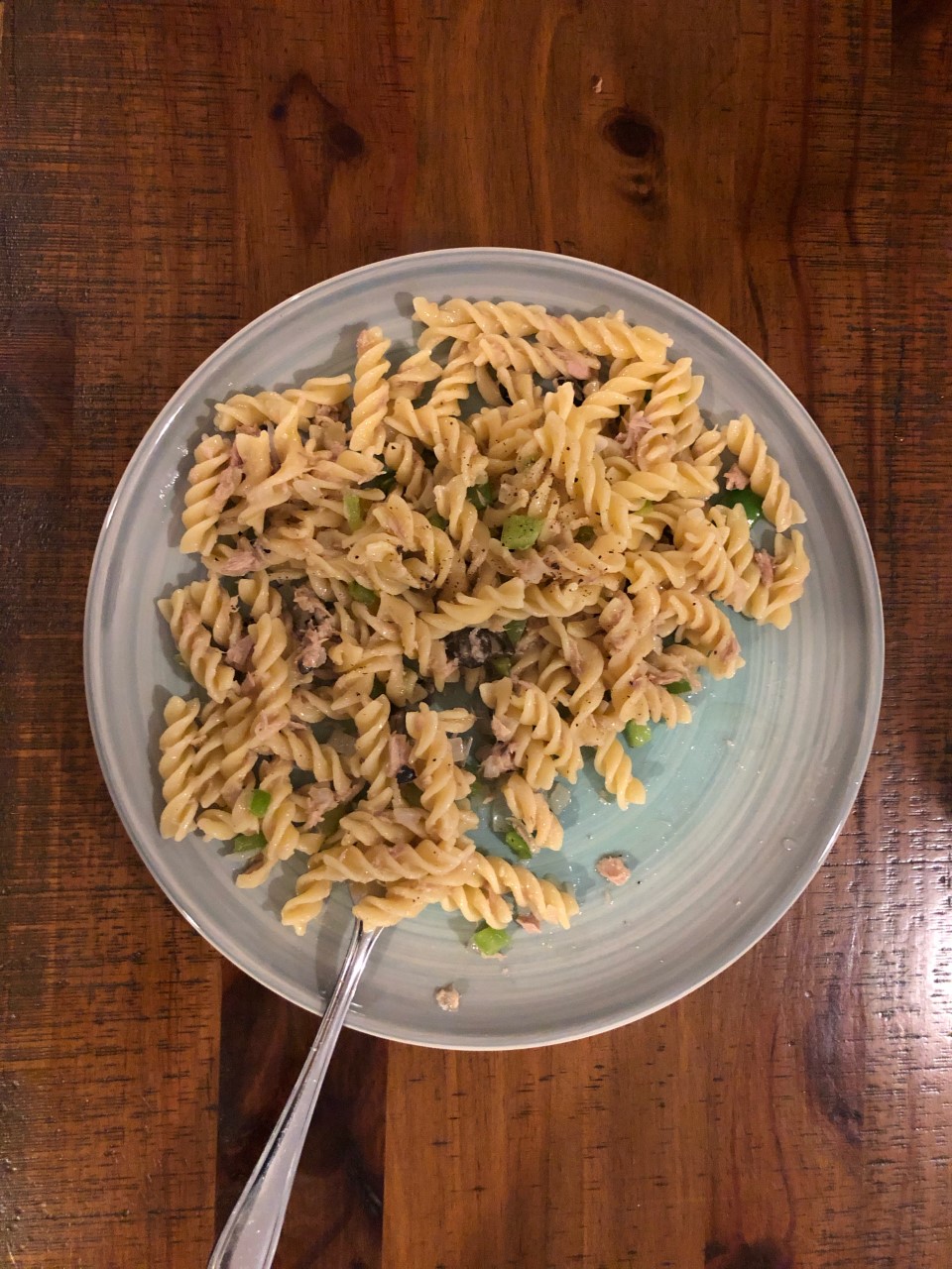 Bring a pan of salted water on the boil, the add the pasta (any type!) – Fry 1 x onion and 2 x cloves of garlic together in olive oil in a saucepan – Add 2 x tins of tuna in oil, a chopped green pepper and black olives – when the pastas cooked, stir in the tuna sauce and stir, if a little dry, add more olive oil, add salt and black pepper to taste – Serve!