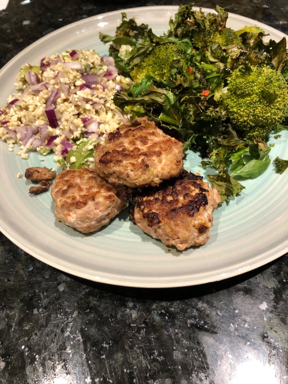 Add 500g turkey mince, 1/2 a chopped red chilli, chopped spring onions ( I use about 4!), 1 x small egg, salt, pepper and 1 tablespoon plain flour to a bowl – scrunch the mixture together with your hands and make into burgers ( I make approx 12 small ones but you can make fewer big ones! Whatever suits! ) – pan fry in olive oil for approx 10 mins or until cooked through! – Serve!